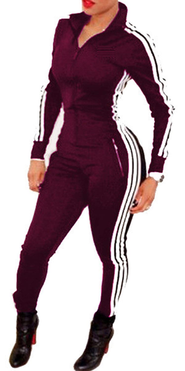 Enggras Women's Striped Zip Up Long Sleeve Sport Workout Bodycon Jumpsuit Romper Zentai Bodysuit